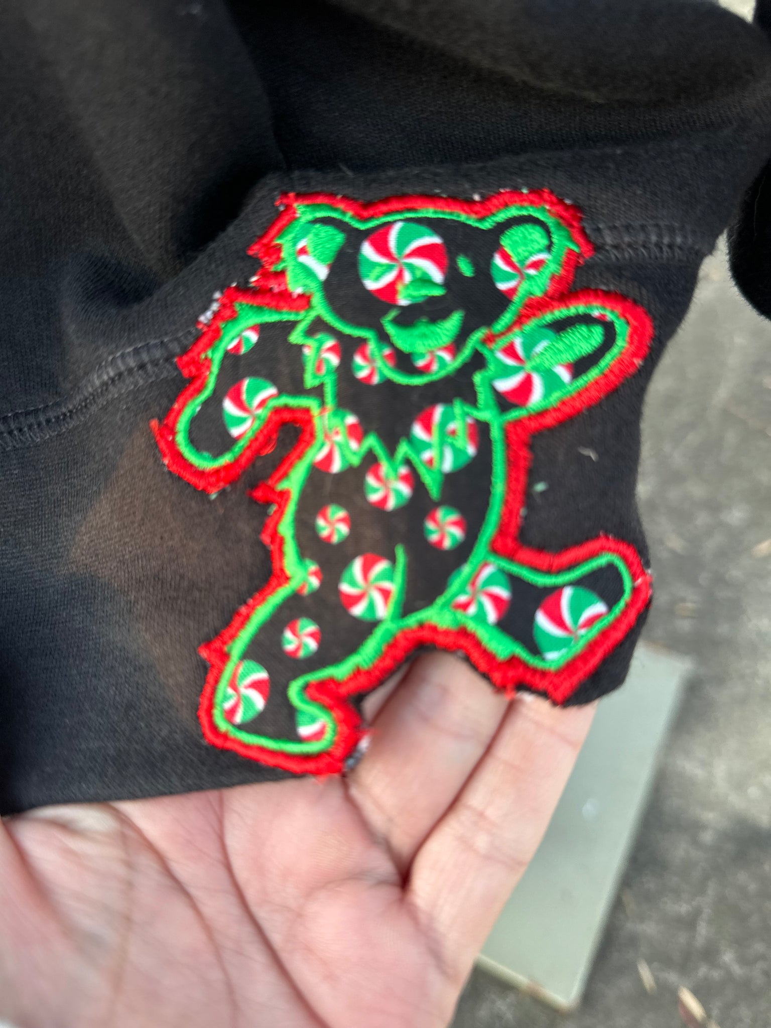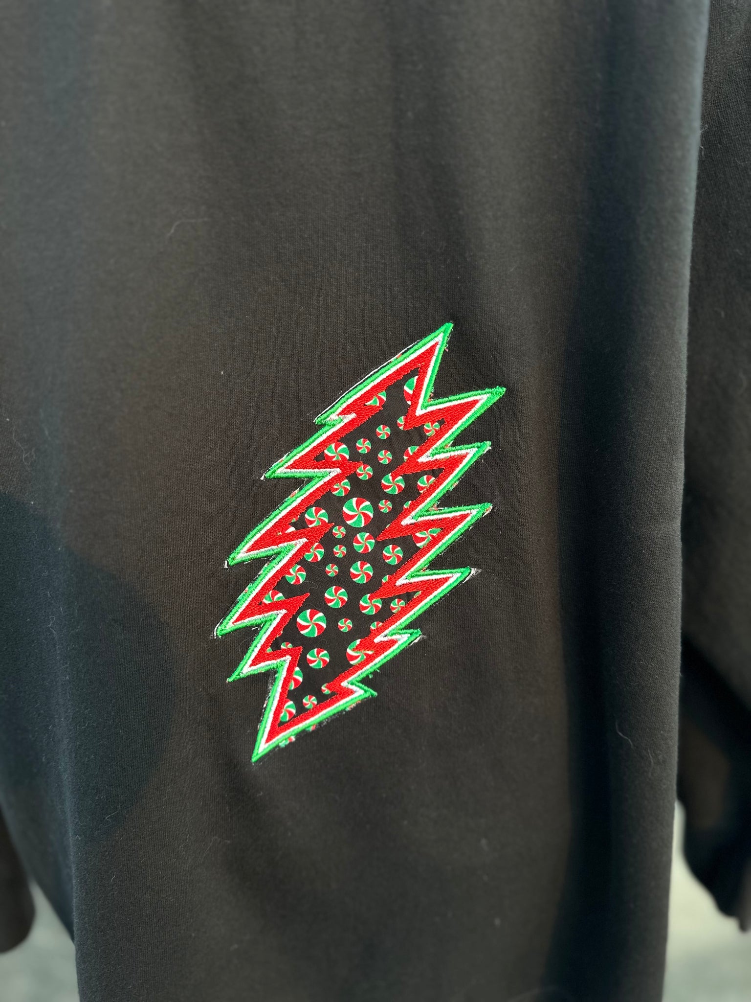 Women’s Sz 3XL Christmas peppermint crew neck sweatshirt. This design is so festive and cute! Women’s black crew neck with a red, green and white stealie embroidered on the front. The back features a triple outlined peppermint bolt! I added some peppermint marching bears to the sides for some extra Christmas cheer.
