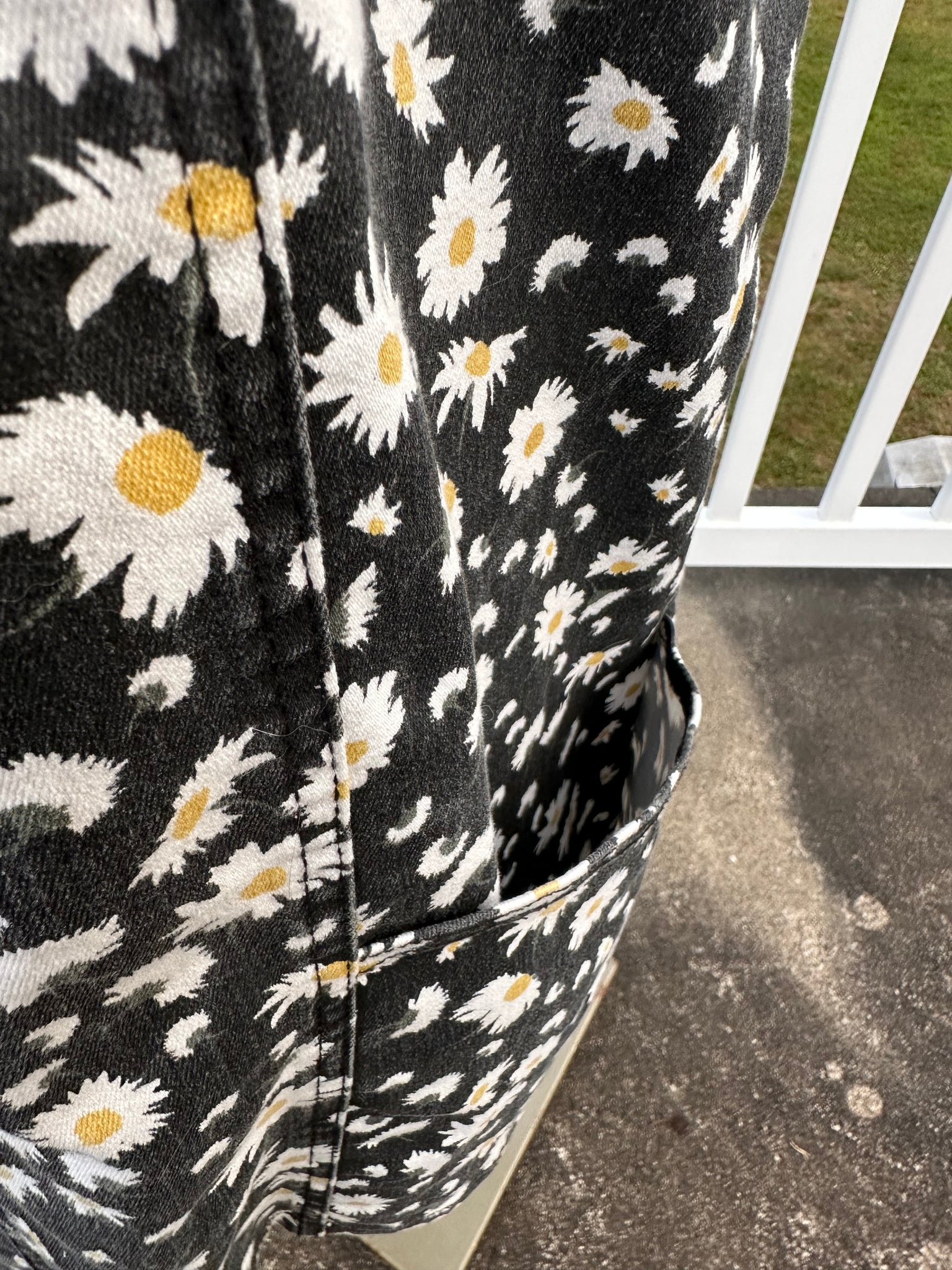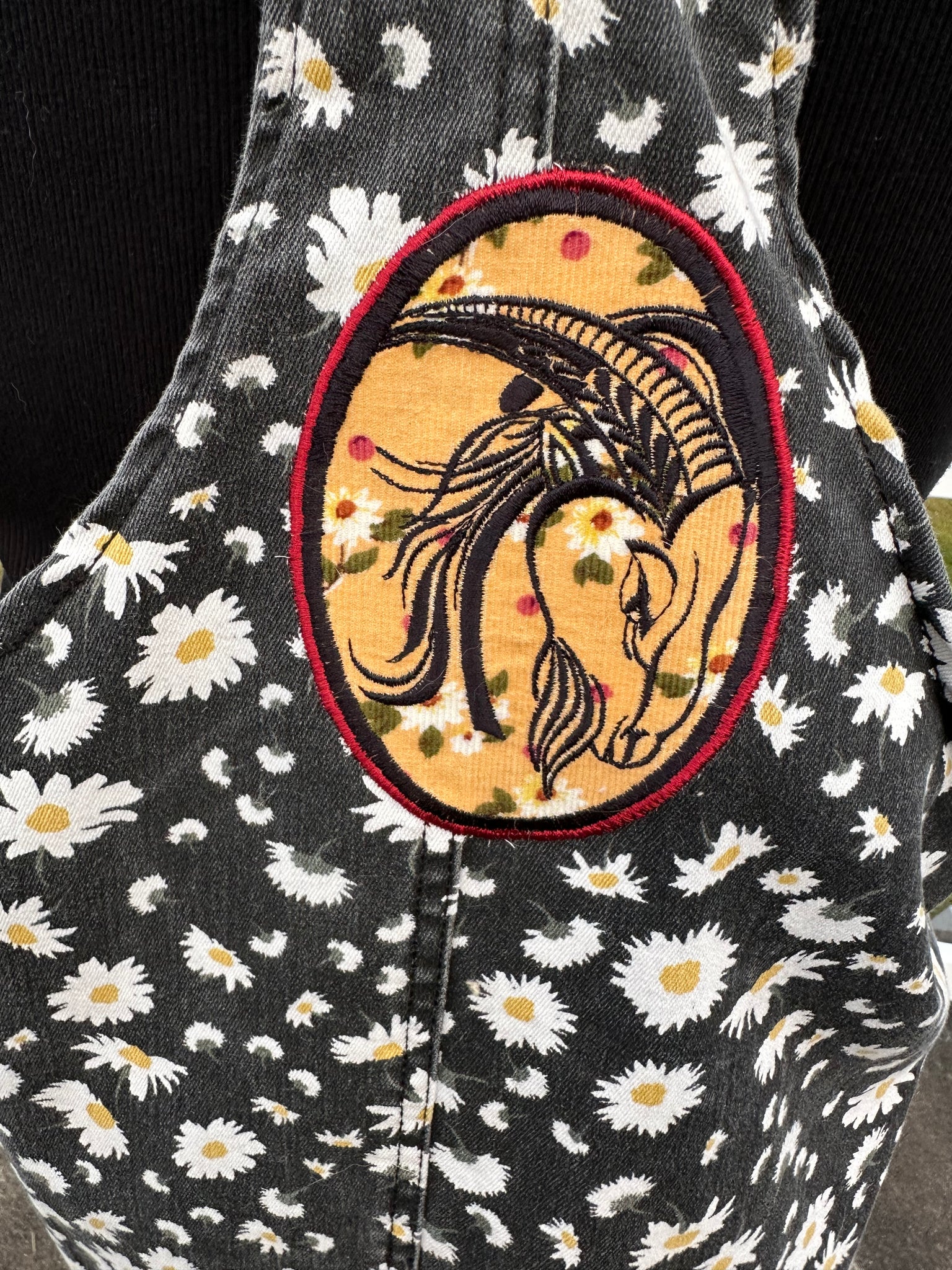No Boundaries brand black washed denim overall dress. This dress features a custom made Red Daisy appliqué on the front and a custom Billy goat on the back. Super comfy and cute with pockets and a bit of stretch for comfort.