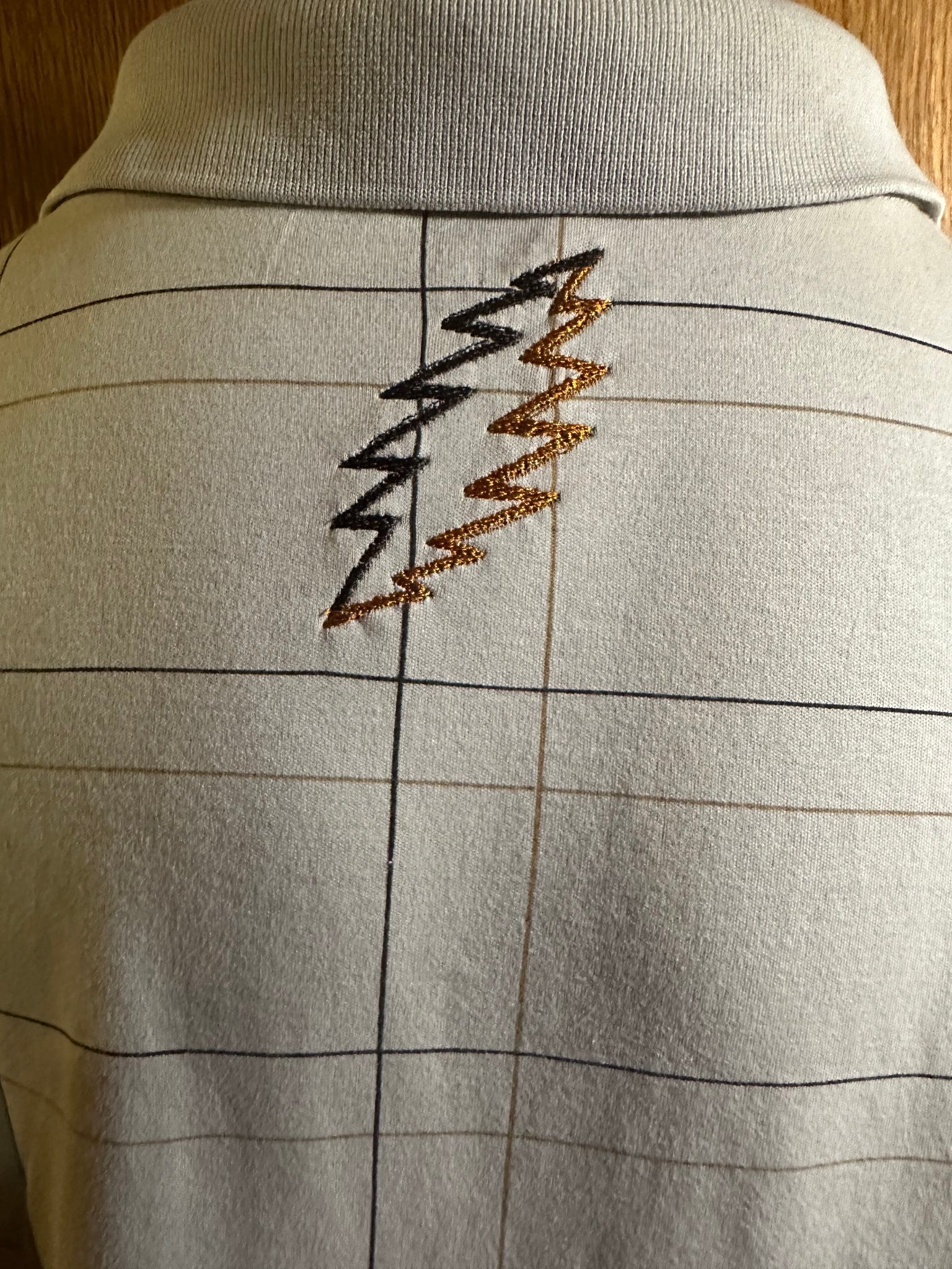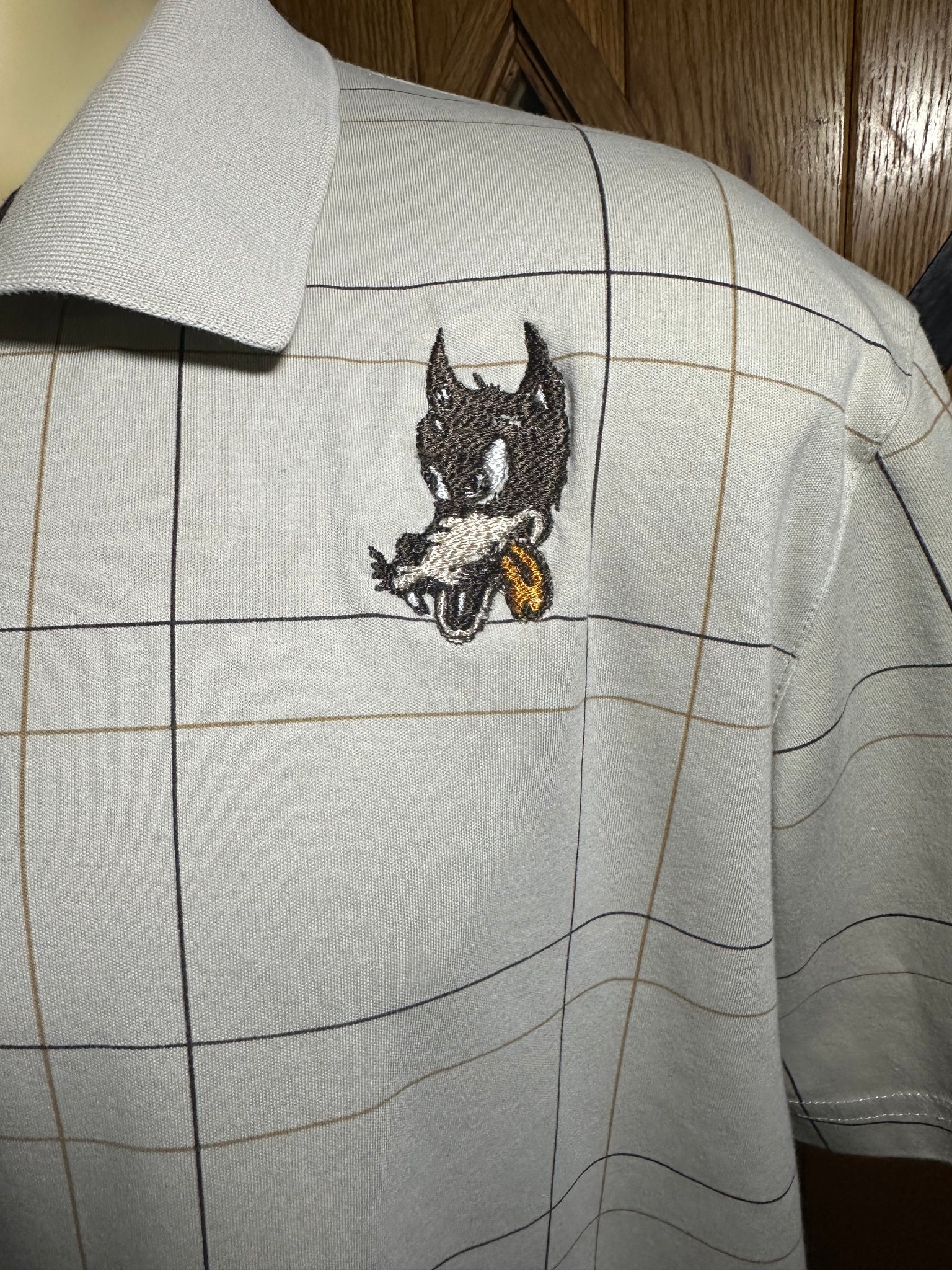 Men’s Sz XL high quality tan, brown and orange plaid polo with a wolf embroidered on the front and a brown and orange bolt on the back. One of a kind
