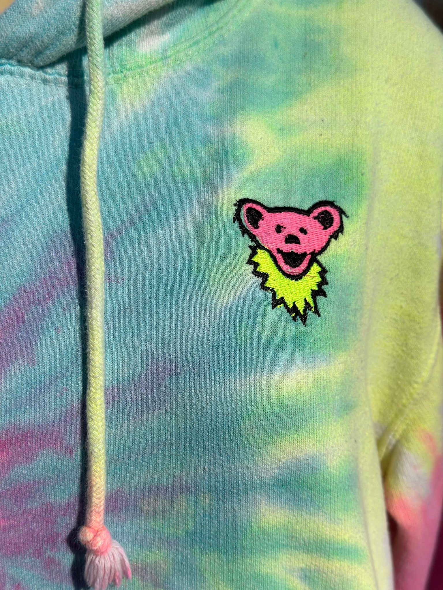 Sz S tie dyed pullover fleece hoodie with neon bear embroidery