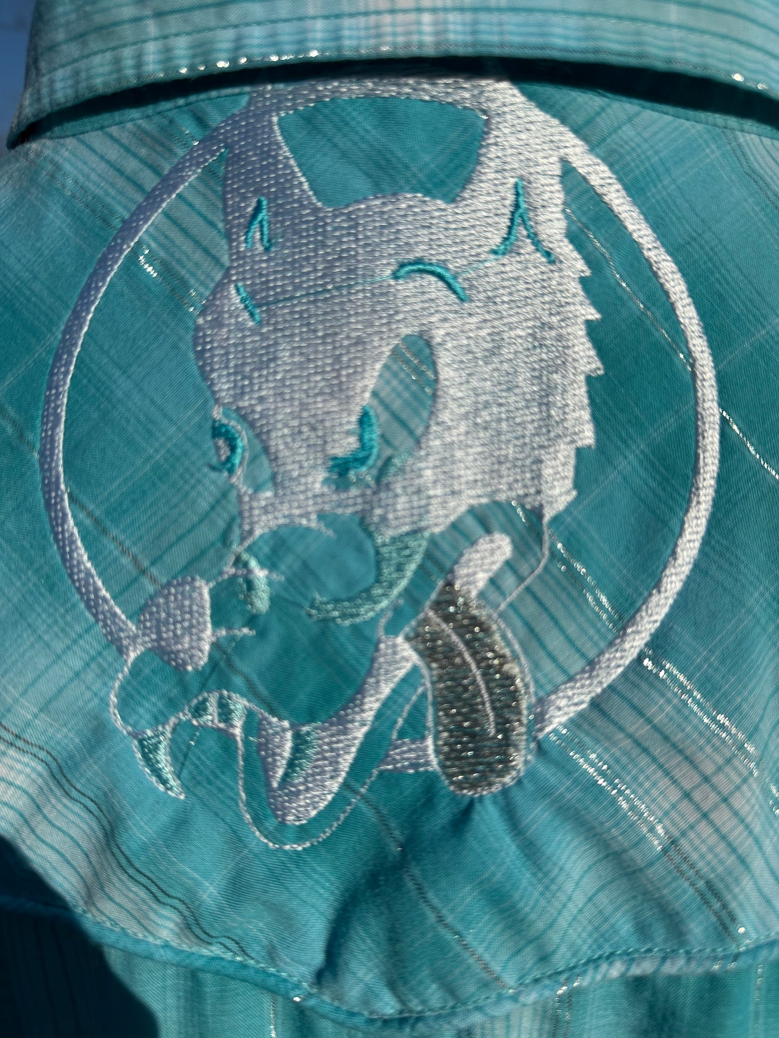 Women’s Sz XL gorgeous aqua and white plaid  pearl snap western with silver thread through the plaid. The front has glitter white bolts outlined in aqua and white thread. The back features a white embroidered wolf with a metallic silver tongue and aqua eyes and accents. I also added a white glitter stealie on the left sleeve. This shirt is a one of a kind collectors piece show stopper!  Free shipping