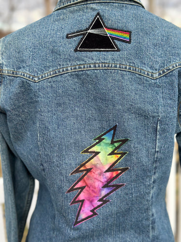 Women’s Sz L denim shirt jacket with tie dyed bolt and Pink Floyd appliqué.