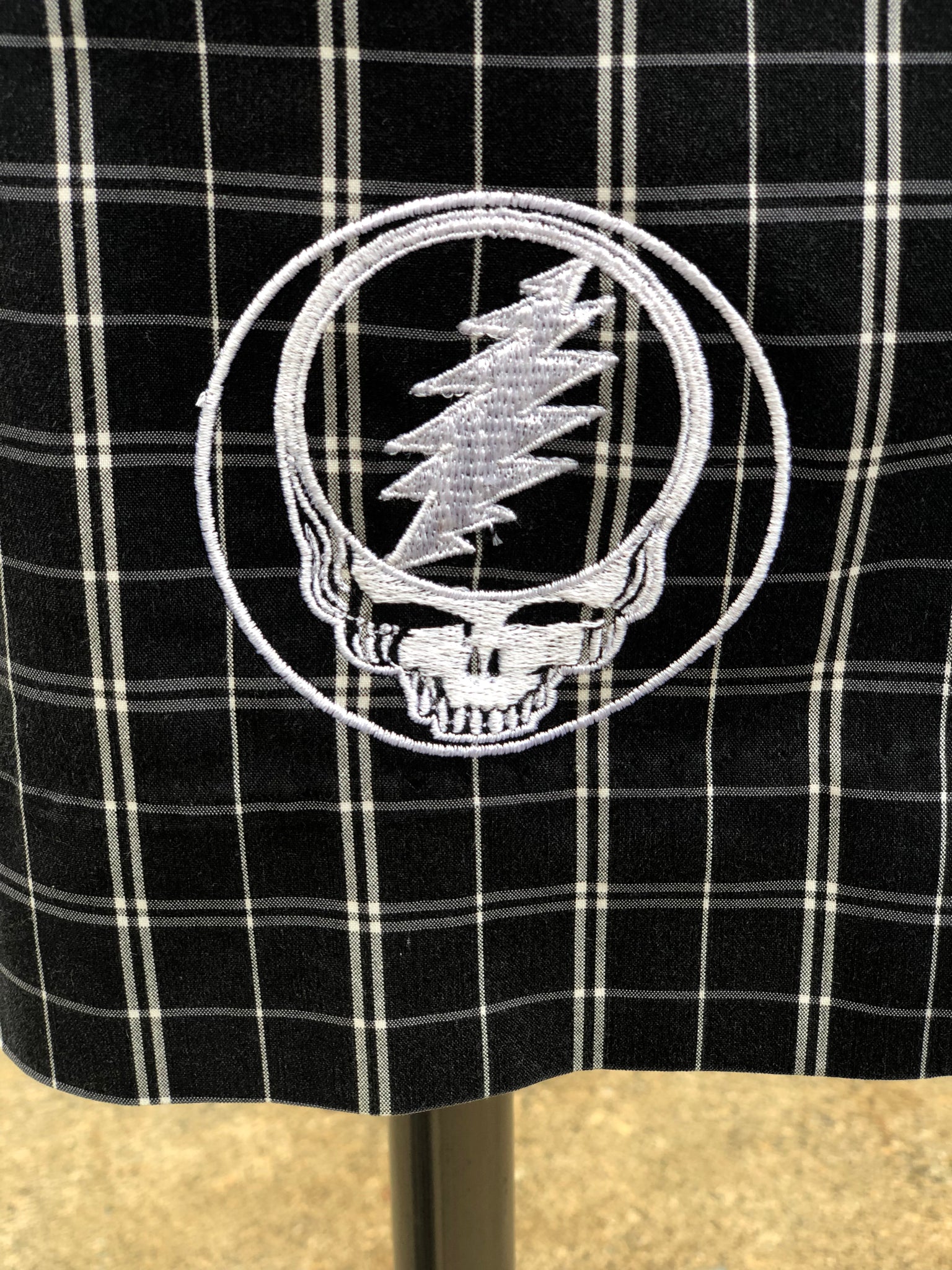 Nice dri fit black plaid shorts with a stealie embroidered on the front and a dancing skeleton on the back. These shorts have a bit of stretch for maximum comfort.