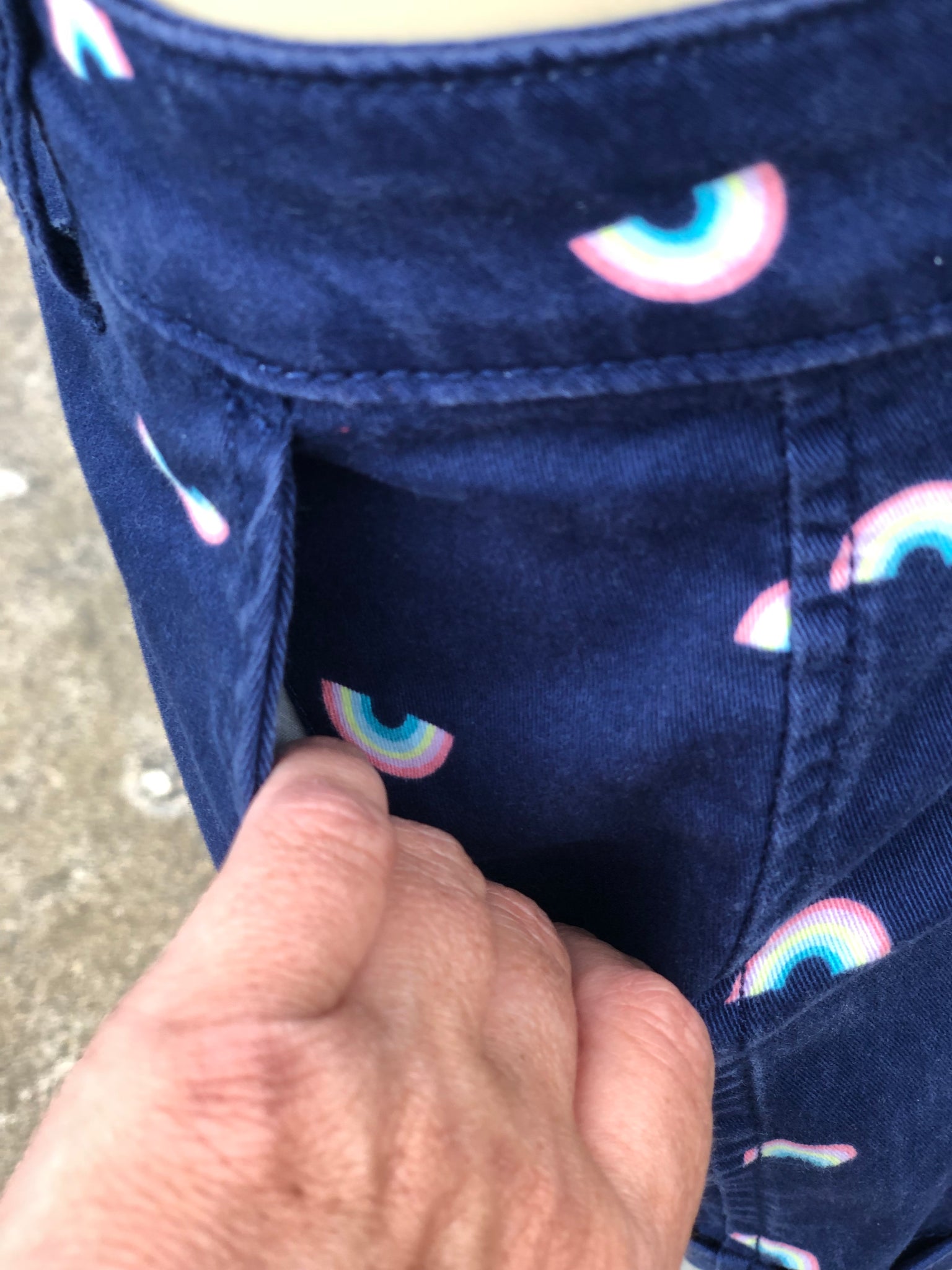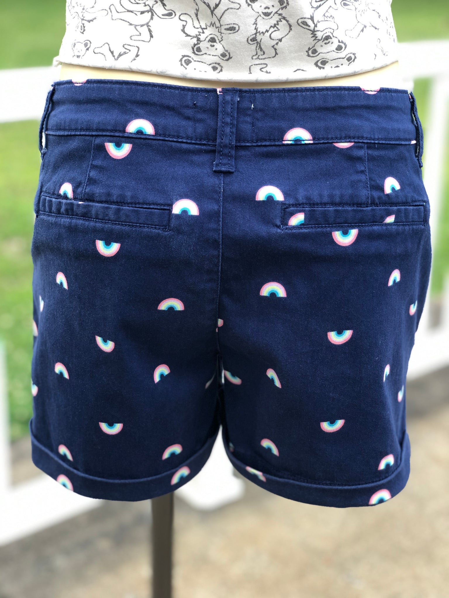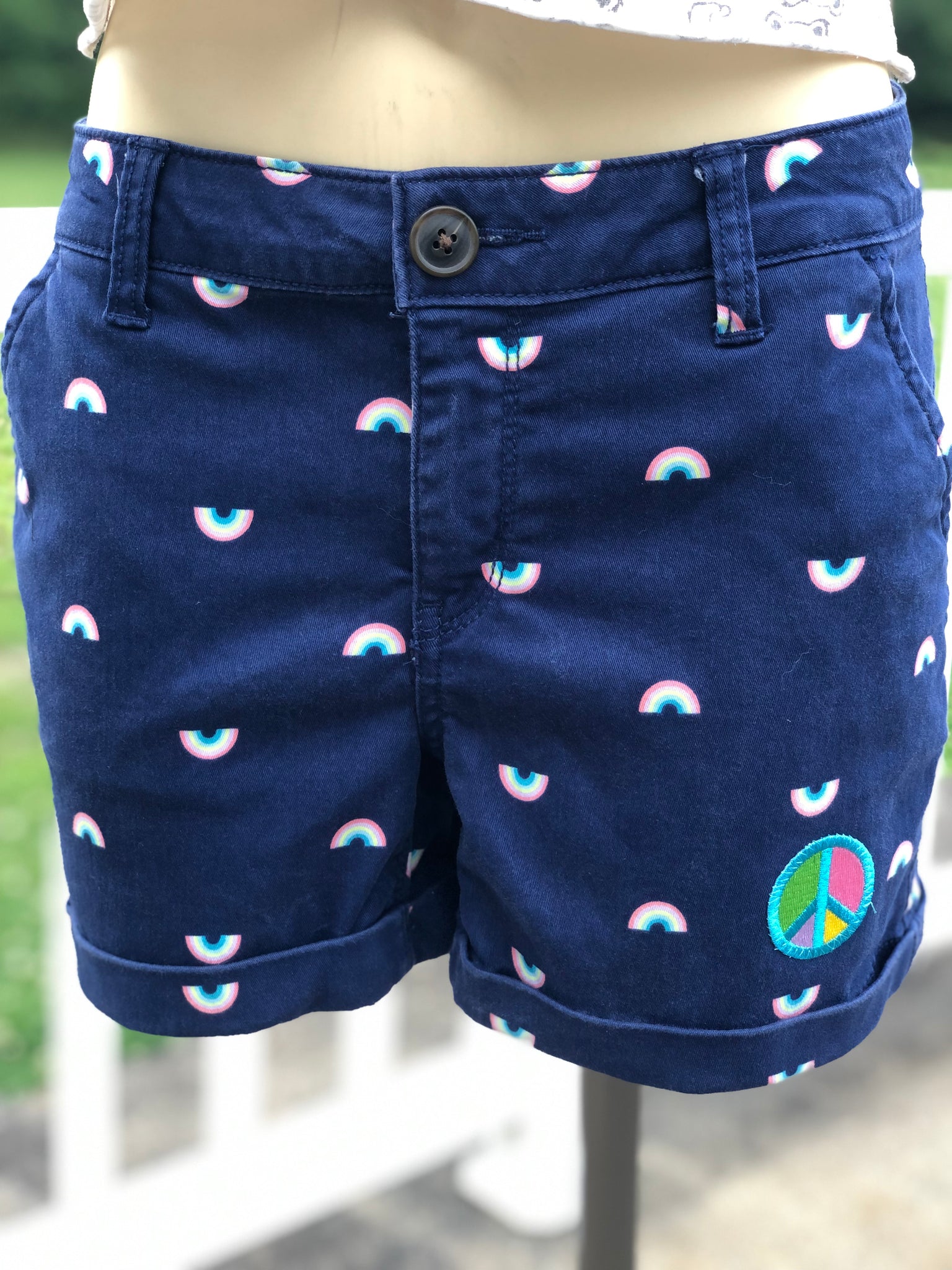 Women’s Sz 5 navy blue shorts with rainbow pattern and a matching peace sign on the front