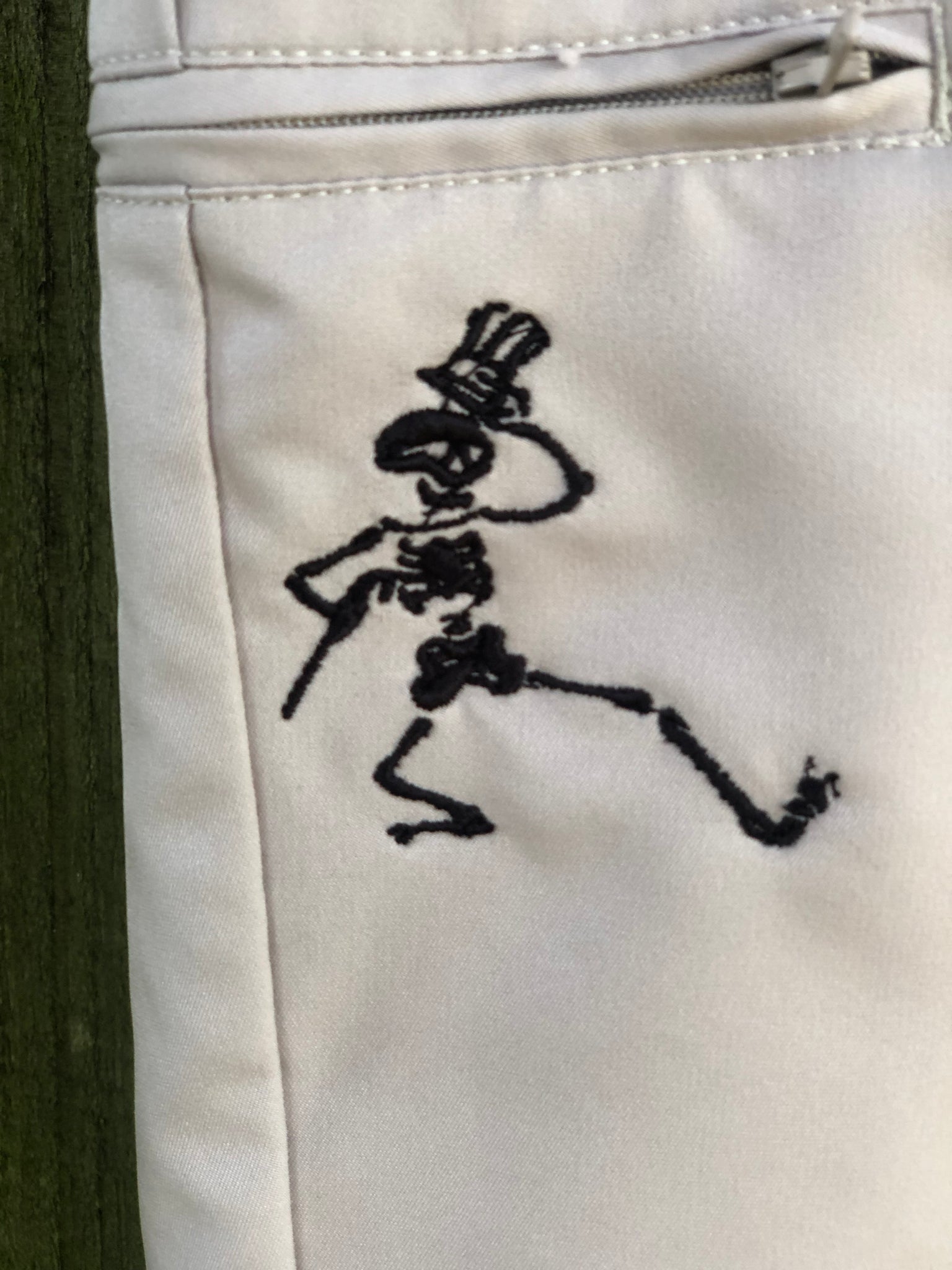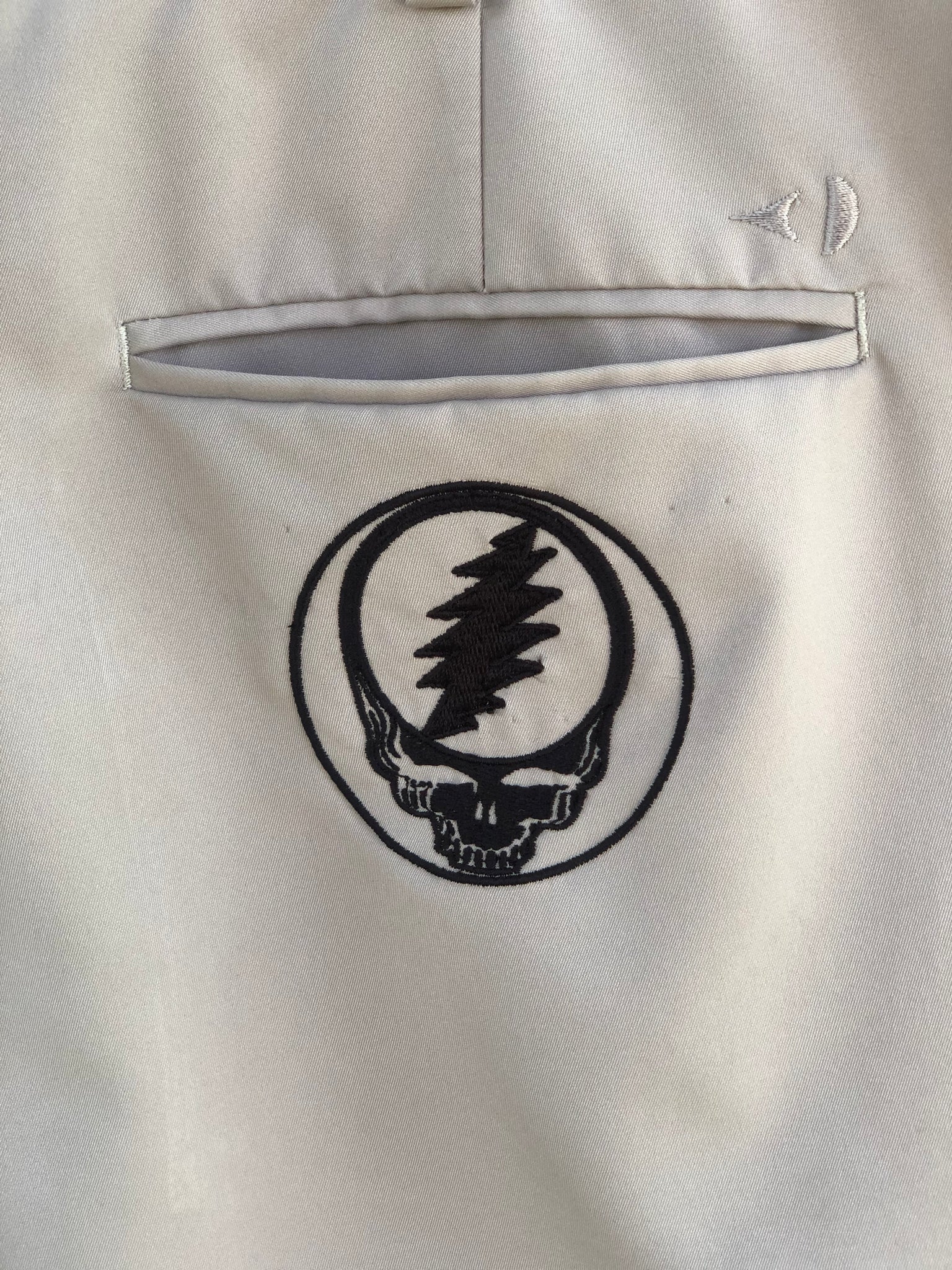 High quality tan colored  golf shorts with front and back  pockets and an extra zipper side pocket. Black stealie embroidered on the back pocket and an embroidered black dancing skeleton on the side zipper pocket.