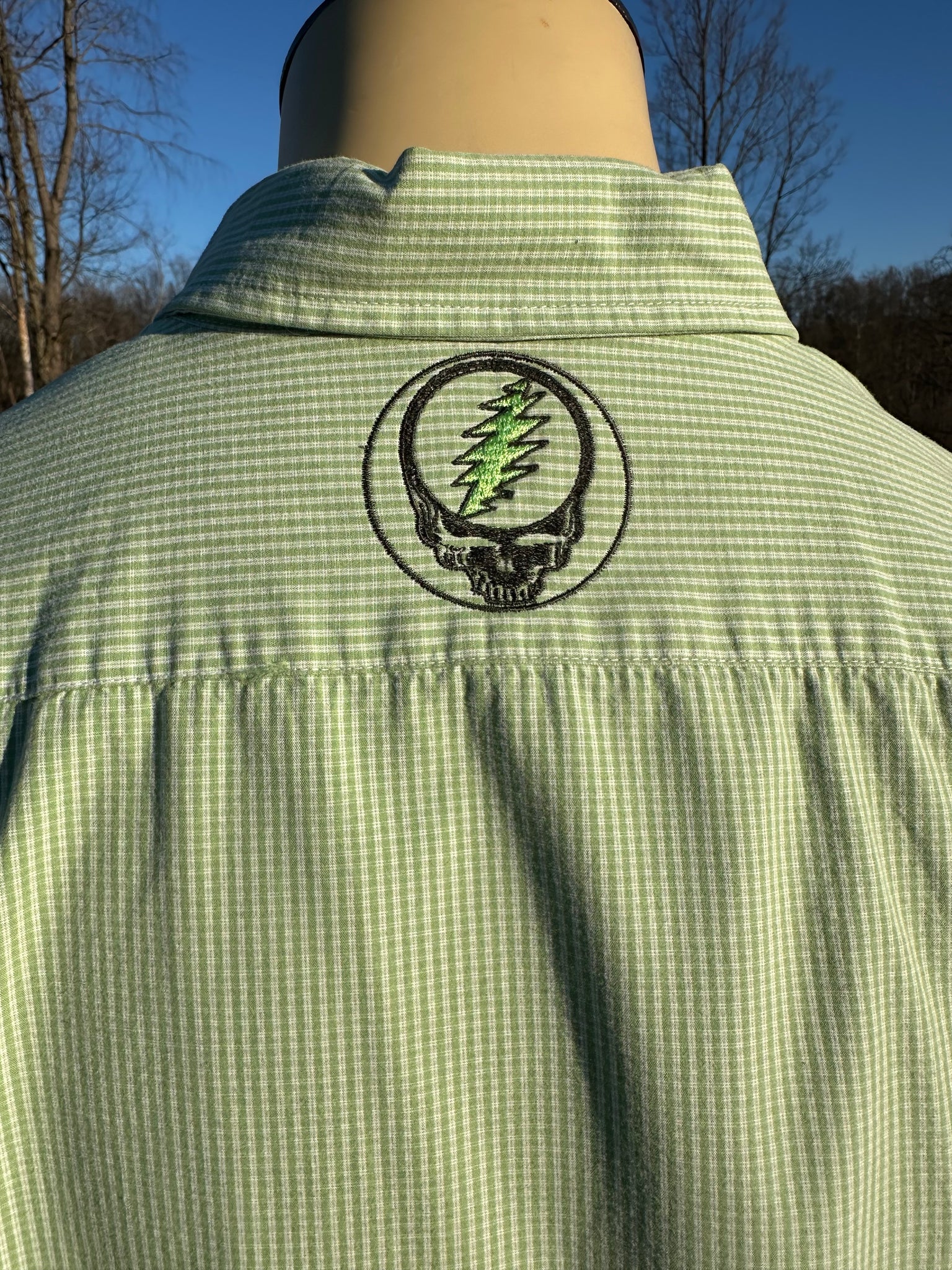 Sz L high quality Izod embroidered button down. I love this green color plaid! The color is fresh and it feels really nice. Steal your Lucky Lightning 4 leaf clover on the front pocket? Micro marching bear on wrist cuff and a custom green stealie on the back. One of a kind and built to last.