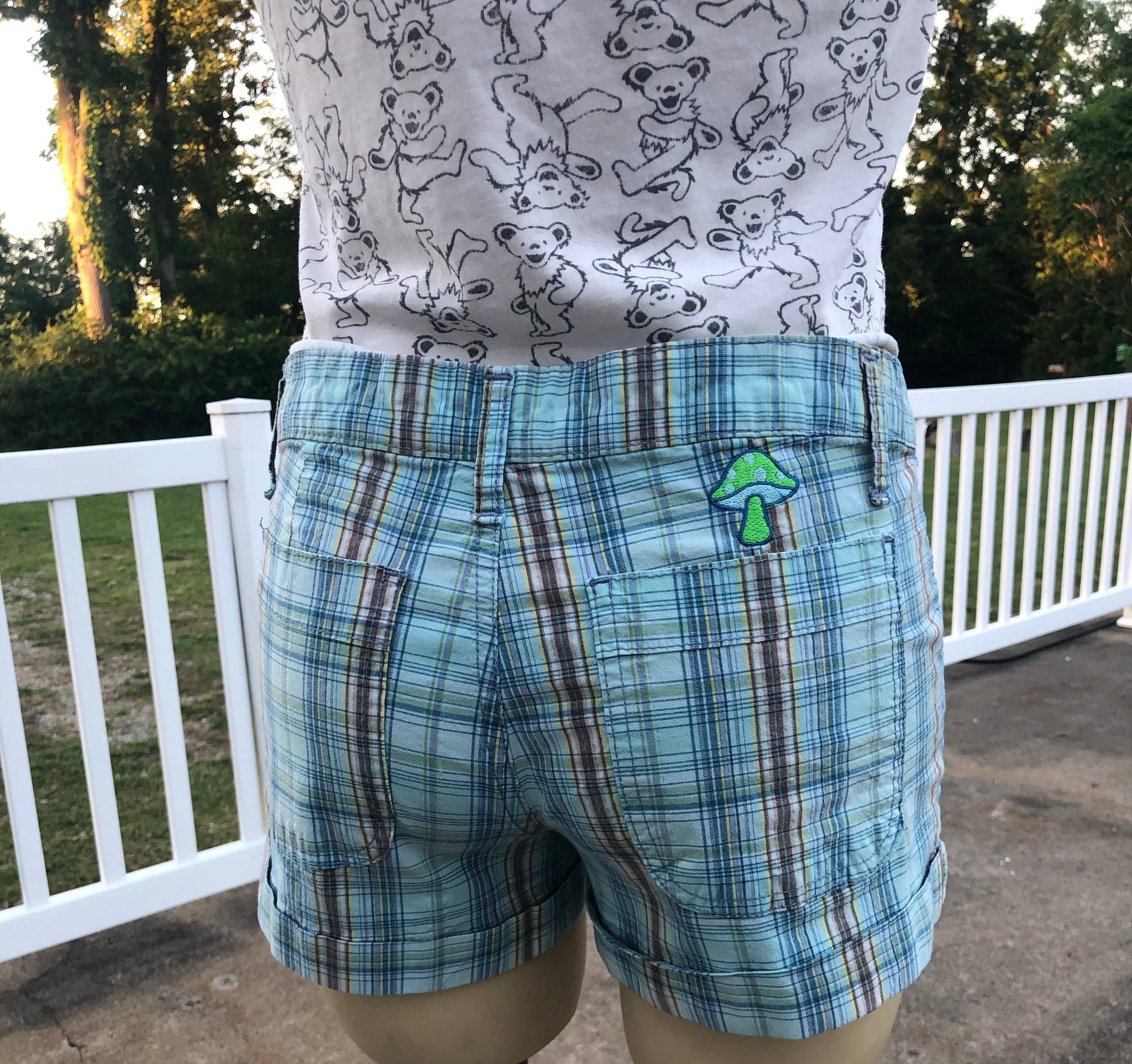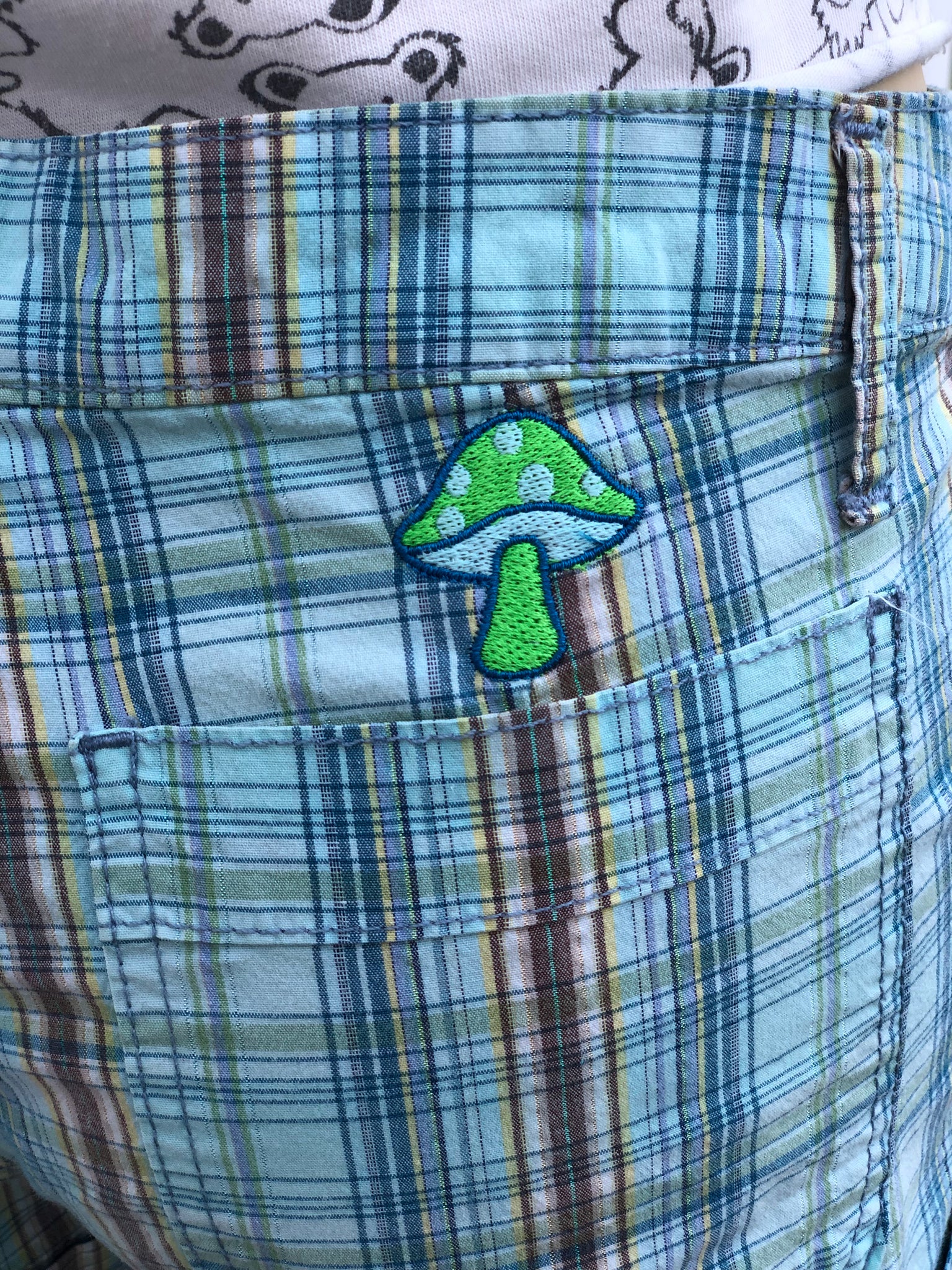 Sz M Lei brand These are such cute little shorts. The colors are fantastic, the plaid has light catching metallic thread woven through it. Aqua and dark grey bear embroidered on the front and a mushroom on the back.