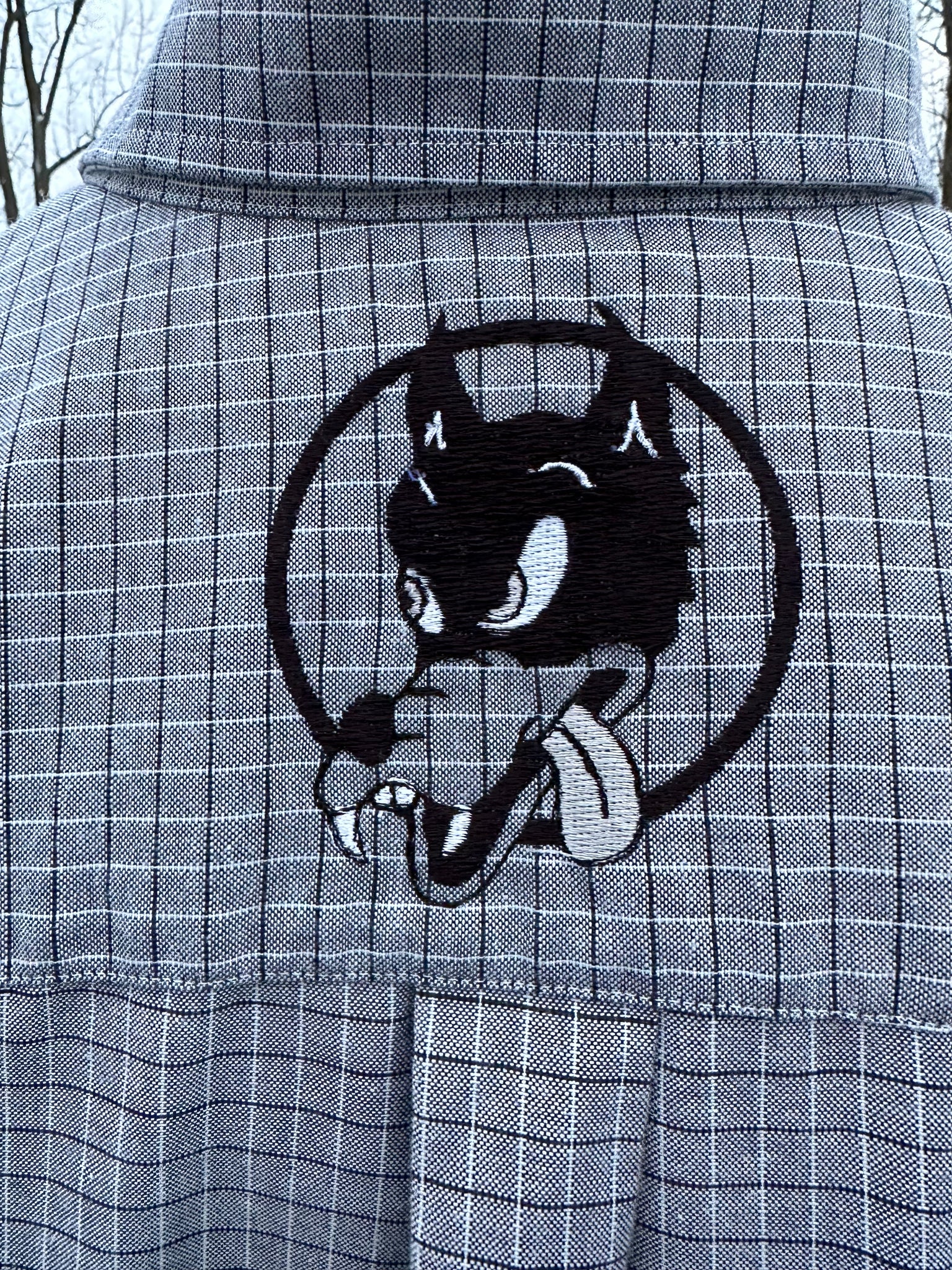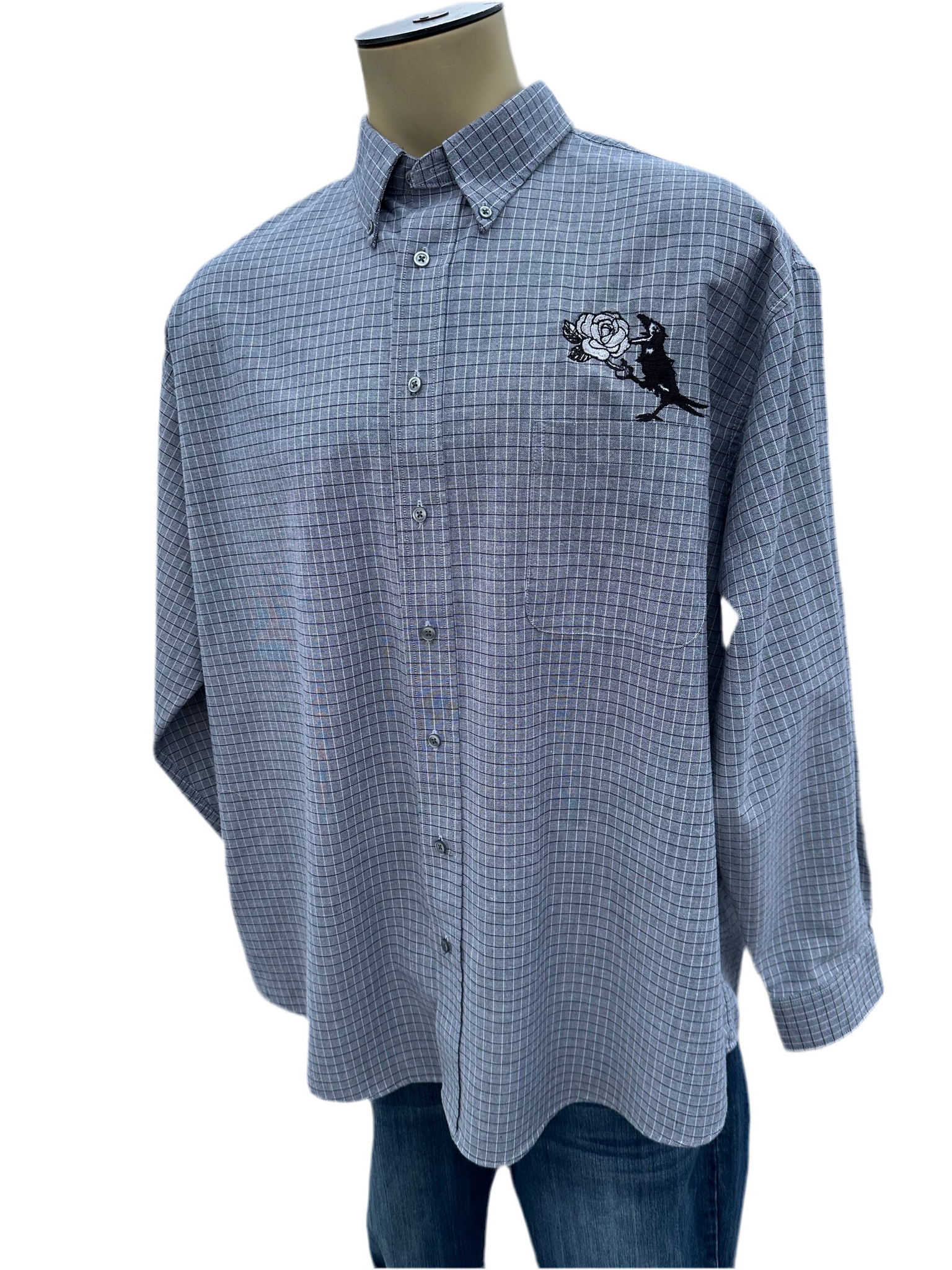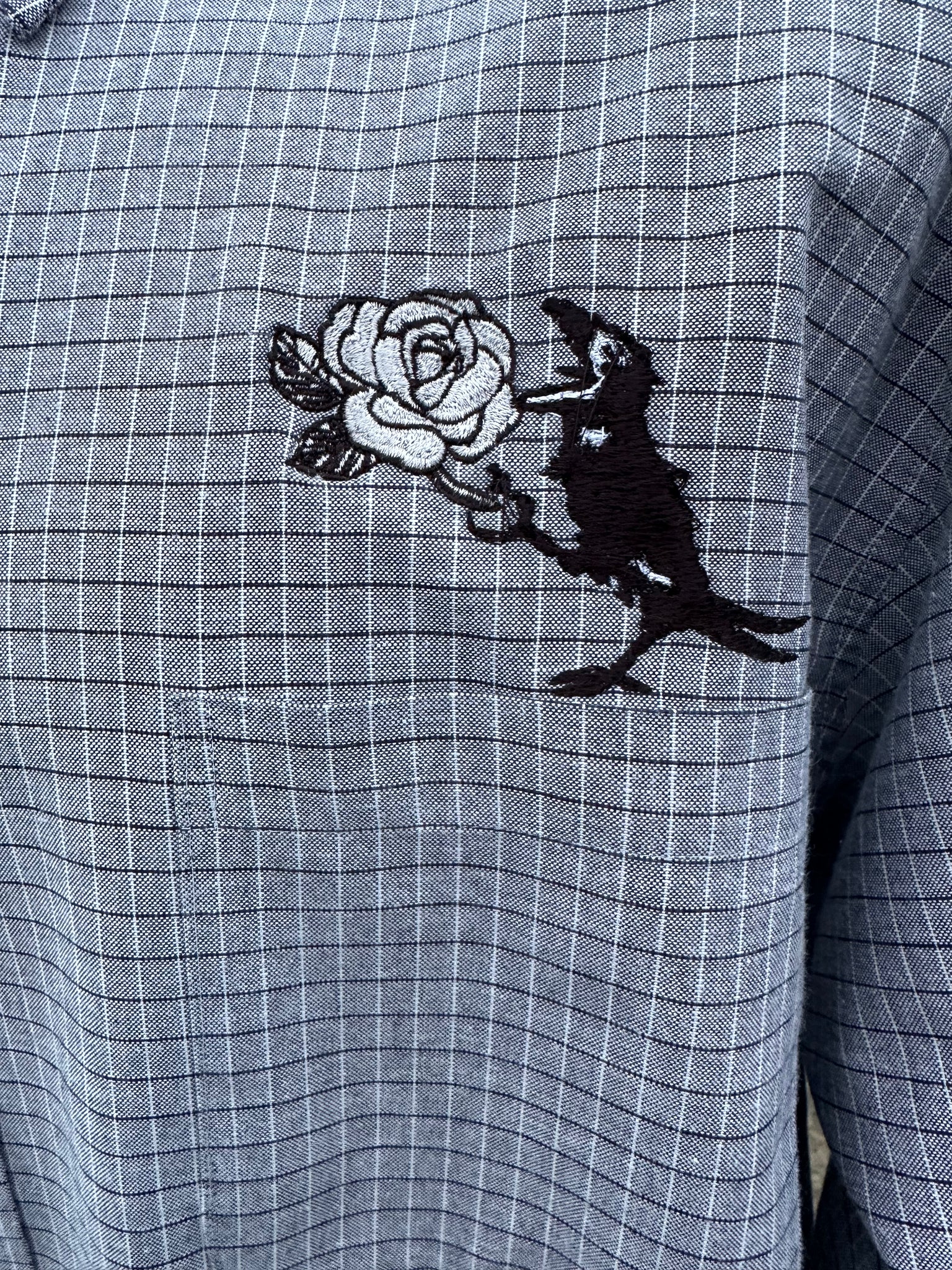 Easy care wrinkle free gorgeous shirt with a black and grey wolf embroidered on the back and a crow with a rose coming out of the front pocket. One of a kind collectors piece